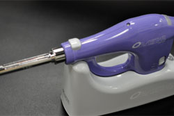 患者さんの歯科局所麻酔からくる苦痛をできるだけ和らげる為に、当院では表面麻酔の塗り薬を使用してから左の画像のような電動式の麻酔器材にて局所麻酔を行っております。