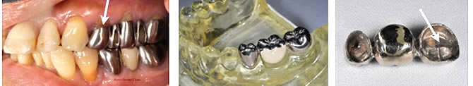 審美性はもちろん、耐久性(銀歯の内面が変形や腐食しやすい)が悪いため、歯根の露出や人工物の変色、変形が認められて噛み合わせが悪くなっています。そして何よりもやり直しの再治療の際にさらに歯を削らなくてはいけない状態が多いことです。それによって同じ治療方法で治療できないない事があり、別の治療方法(入れ歯や人工物の設計が増えるなど)になる事もあります。