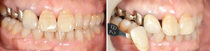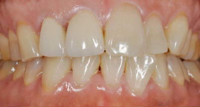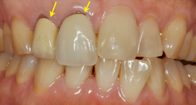 画像の患者様は歯の色と矢印で示された差し歯の色と適合の改善を希望されていました。