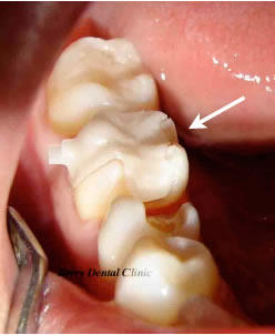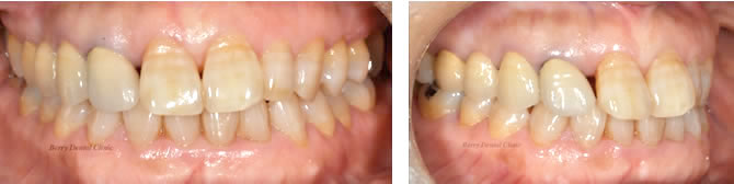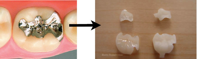 下の画像は保険で使用される銀歯治療と実際のお口の中の症例です。