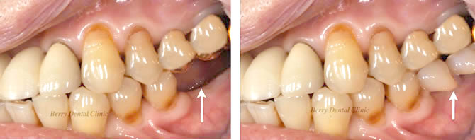 この症例では左の画像の矢印のように奥歯2本が欠損しているので、右の画像で奥番2本を入れたときのシュミレーションの画像を患者さんに説明しました。