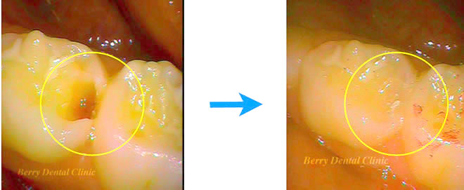 乳歯の奥の虫歯も綺麗に除去してあまり目立たないように白い詰め物で充填しました。