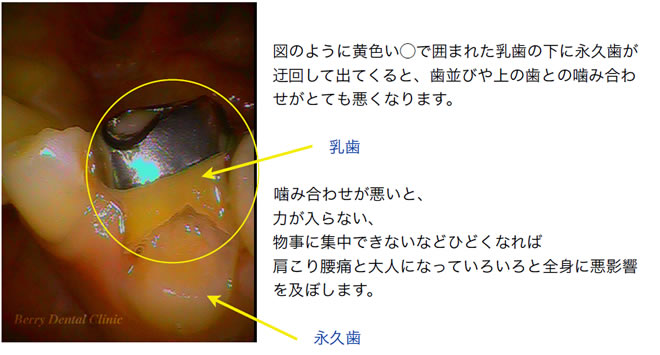小児のお子様の場合6歳前後から乳歯と永久歯との交換がはじまります。そのため乳歯がなかなか抜けきれずに後から生えてくる永久歯が既に出てしまったり、迂回して生えてくると歯並びや噛み合わせが悪くなり大人になってから全身に悪い影響が出たりもします。