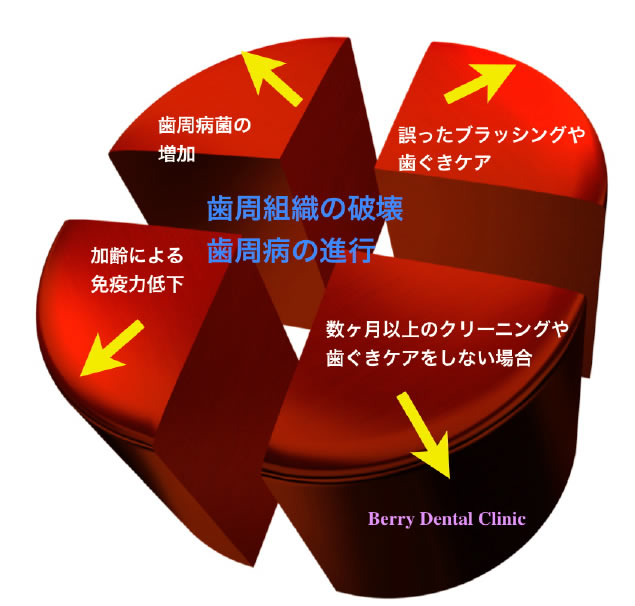 1 歯周病菌の増加ー歯周病にさせる細菌の数が増えて歯周組織を破壊させていきます。